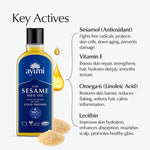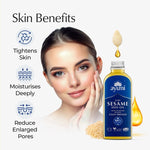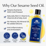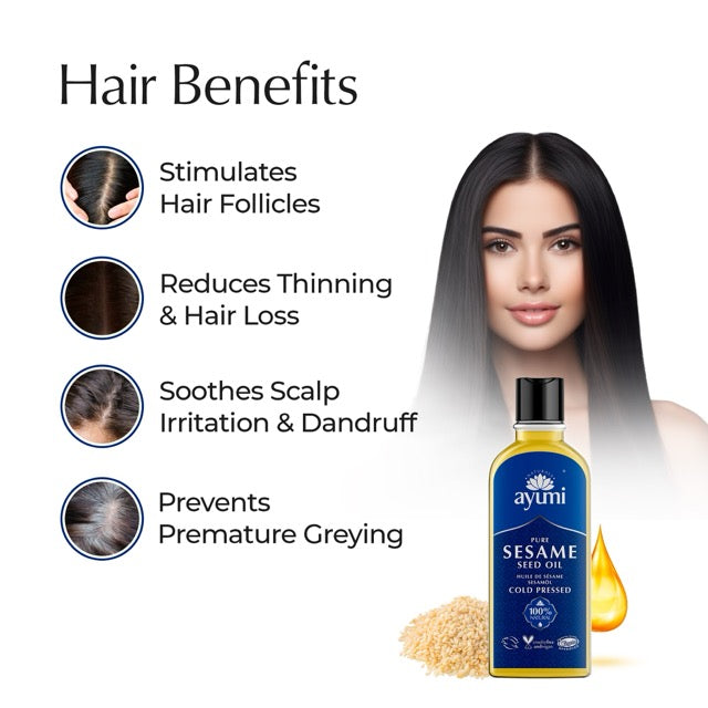 Sesame seed oil is rich in vitamin E, B-complex vitamins, and minerals like zinc. It strengthens hair, promotes growth, hydrates the skin, reduces inflammation, and provides antioxidant protection for overall hair and skin health.